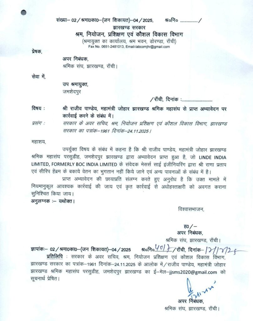 जमशेदपुर : औद्योगिक इकाई Linde India Limited (पूर्व नाम—BOC India Limited), बर्मामाइंस में श्रमिक अधिकारों के गंभीर उल्लंघन का मामला सामने आया है।