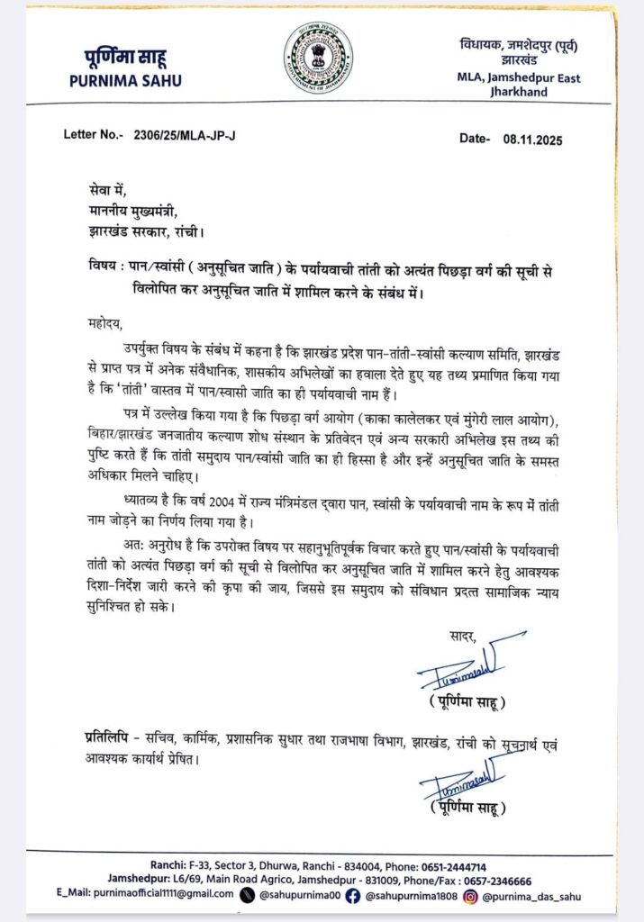 विधायक पूर्णिमा साहू ने अपने पत्र में झारखंड प्रदेश पान-तांती-स्वांसी कल्याण समिति द्वारा उपलब्ध कराए गए दस्तावेजों का हवाला देते हुए कहा कि