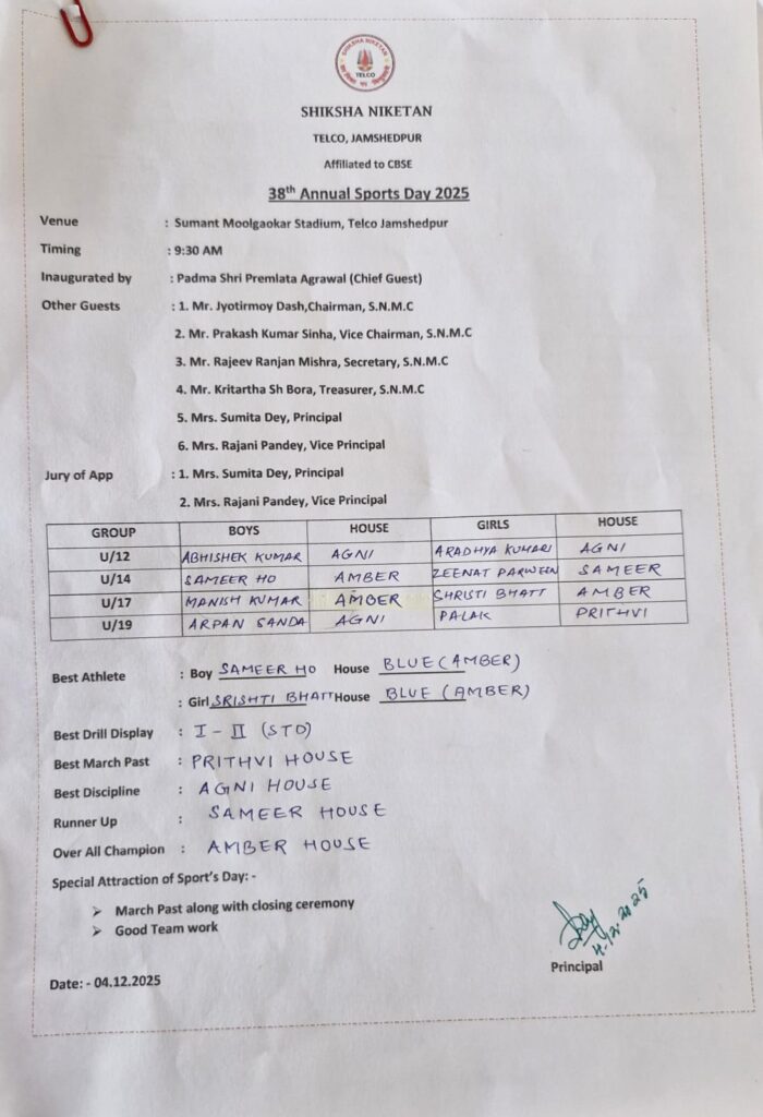 जमशेदपुर : टेल्को स्थित सुमंत मूलगांवकर स्टेडियम में शिक्षा निकेतन विद्यालय का 38वां वार्षिक खेलकूद महोत्सव अत्यंत उत्साह और भव्यता के साथ आयोजित किया गया। खेल, संस्कृति और अनुशासन के इस अनोखे संगम में विद्यार्थियों ने अपनी प्रतिभा का शानदार प्रदर्शन किया।