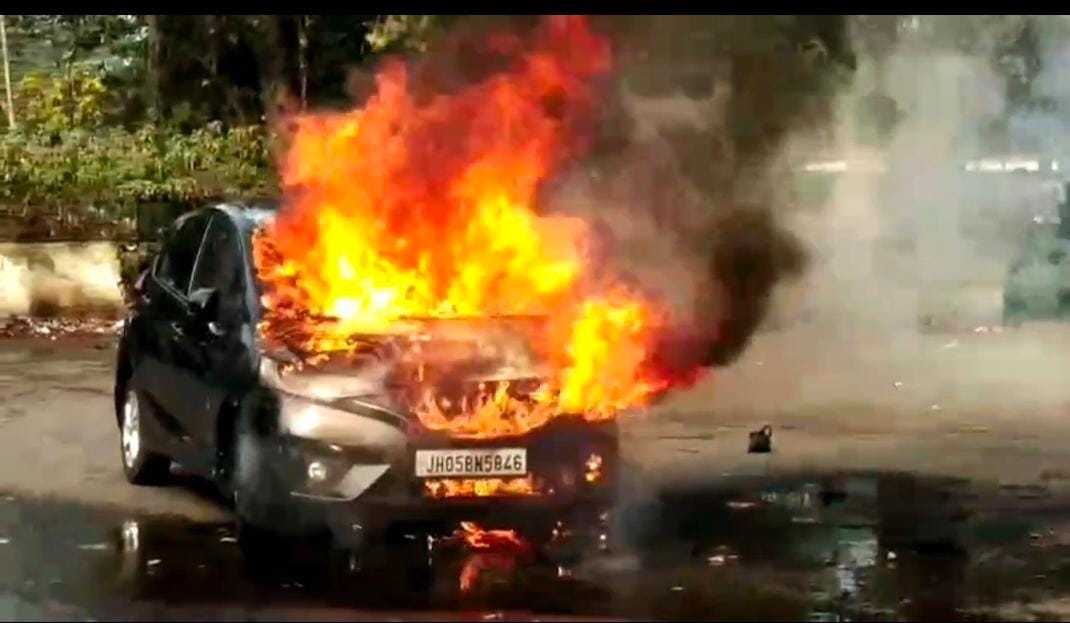 टाटानगर स्टेशन के बाहर खड़ी कार में अचानक लगी आग, परिवार बाल-बाल बचा